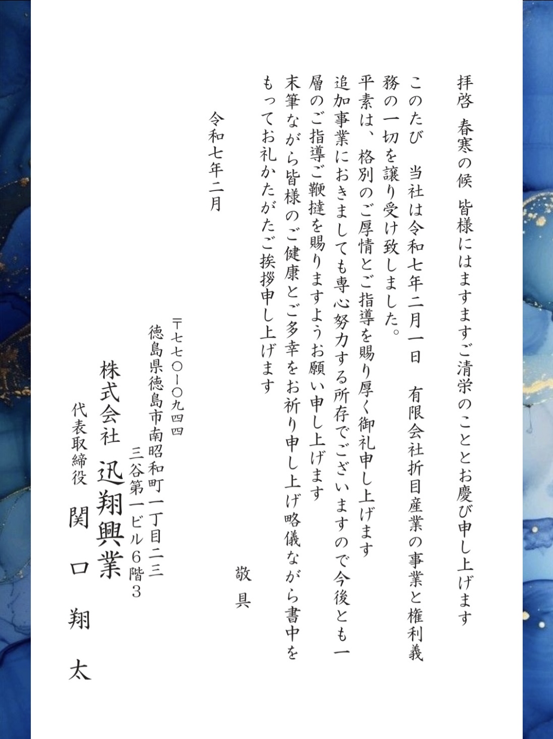 このたび 当社は令和七年二月一日 有限会社折目産業の事業と権利義務の一切を譲り受け致しました。